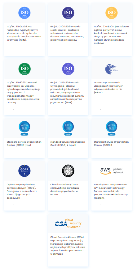- SOC 2 (Service Organization Control 2): To amerykański standard audytowy, który ocenia, jak dostawca usług zarządza danymi klientów w oparciu o pięć zasad: bezpieczeństwo, dostępność, integralność przetwarzania, poufność i prywatność. Raport SOC 2 jest bardzo szczegółowy, ale zazwyczaj poufny. Czasem firmy udostępniają raport SOC 3, który jest jego publiczną, mniej szczegółową wersją.
